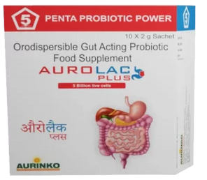 Orodispersible Gut Acting Probiotic Food Supplement   AUROLAC PLUS is a delectable blend of 5 Gut Acting Probiotics to maintain intestinal pH, improve gut protection, promote healthy digestion and enhance gut immunity. AUROLAC PLUS improves...